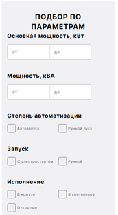 • Задайте ключевые критерии: мощность (кВт), тип топлива (дизель, бензин, газ), тип запуска (ручной, электростартер, АВР), фаза (однофазный/трехфазный).